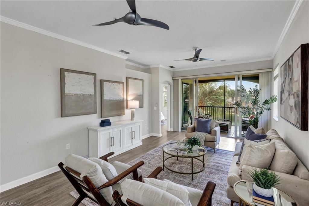 This beautifully renovated 3-bedroom, 2-bath end unit in a sought-after elevator building offers privacy and convenience — with no neighbors above or below and direct elevator access to your door. Current owners have invested over $100,000 in updates to this property, featuring a custom kitchen and bath cabinetry with pull-out storage, Quartz counters and backsplash, stainless steel appliances, new HVAC (2025), hot water heater (2024), easy-to-maintain Coretec brand LVT plank flooring, cr...This beautifully renovated 3-bedroom, 2-bath end unit in a sought-after elevator building offers privacy and convenience — with no neighbors above or below and direct elevator access to your door. Current owners have invested over $100,000 in updates to this property, featuring a custom kitchen and bath cabinetry with pull-out storage, Quartz counters and backsplash, stainless steel appliances, new HVAC (2025), hot water heater (2024), easy-to-maintain Coretec brand LVT plank flooring, crown molding, and modern fans. The lanai overlooks a peaceful lake. Roof, gutters, and soffits replaced in 2023 with no assessment remaining. Located in Rapallo at Coconut Point, an active, neighborly atmosphere with resort-style amenities including: Two lagoon-style pools with waterfalls + spa, Screened junior Olympic lap pool + two satellite pools, Clubhouse with catering kitchen, library & social spaces, 5 Har-Tru tennis courts with on-site pro, Full-time activity & fitness directors, saunas, bocce, walking/bike paths, and lush gardens. Rapallo is perfect for someone who loves an active, social lifestyle and values convenience and connection. This property is located in a vibrant environment where you can walk to dining, shopping, and entertainment, enjoying the energy of the community right outside the door.