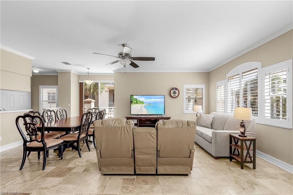 Welcome to this beautifully maintained condo offering serene pond and fountain views in the desirable Spanish Wells Golf Community in Bonita Springs. This spacious open floor plan has 2 bedroom with den and features a large kitchen with black stainless steel appliances (approximately 2 years old), pantry closet, lots of cabinetry and a convenient breakfast bar. The kitchen flows seamlessly into the living room and out to two generous lanais, creating an ideal space for entertaining and everyday ...Welcome to this beautifully maintained condo offering serene pond and fountain views in the desirable Spanish Wells Golf Community in Bonita Springs. This spacious open floor plan has 2 bedroom with den and features a large kitchen with black stainless steel appliances (approximately 2 years old), pantry closet, lots of cabinetry and a convenient breakfast bar. The kitchen flows seamlessly into the living room and out to two generous lanais, creating an ideal space for entertaining and everyday living. One lanai is screened and overlooks the tranquil pond and fountain, which features beautiful lighting at night, providing a peaceful setting for morning coffee or evening relaxation. The versatile den can easily function as a third bedroom for guests, home office, or flex space. Travertine tile enhances the main living areas with plantation shutters and ceiling fans add both style and functionality throughout. The primary suite offers a private retreat with his-and-hers closets, double vanities, a walk-in shower and garden tub. The split bedroom floor plan is ideal for your family and guests. Some additional highlights include newer HVAC system, newer hot water heater and washer and dryer are included. This unit has a 1-car attached garage with newer garage door opener. The upper corner location provides extra windows and exceptional natural light. This residence is situated on a quiet street with sidewalks and offers a peaceful setting while remaining close to Gulf beaches, shopping, dining, golf, and entertainment.A wonderful opportunity for a full-time residence, seasonal retreat, or investment property in the heart of Bonita Springs.